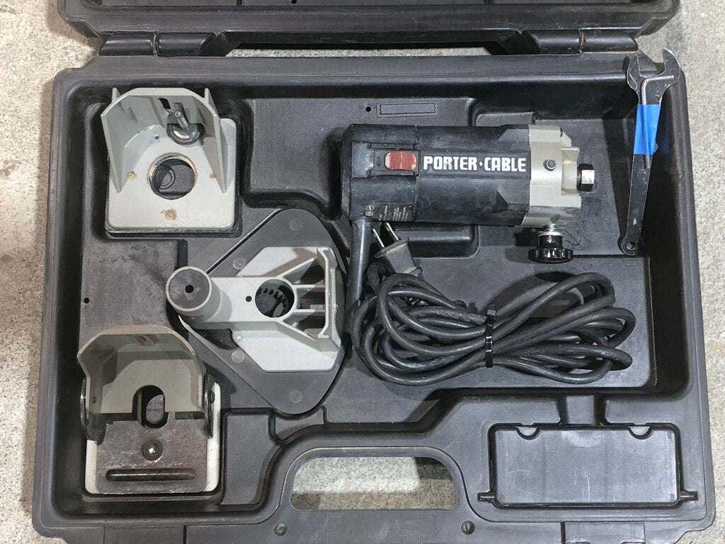 Porter Cable Laminate Trimmer Kit with Model 7301 HD Power Unit, Model 7318 Tilt Laminate Trimmer Base, Model 7311 Offset Laminate Trimmer Base, & Model 7309 Laminate Trimmer Base.
