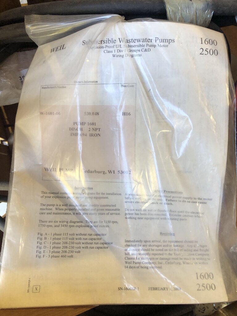 Weil Model W-1601-16 Submersible Wastewater Pump, 2-HP, 2" NPT Discharge, 694 Iron Impeller, Floor Mount, 3-Phase, 460-Volt. *NEW NEVER USED*